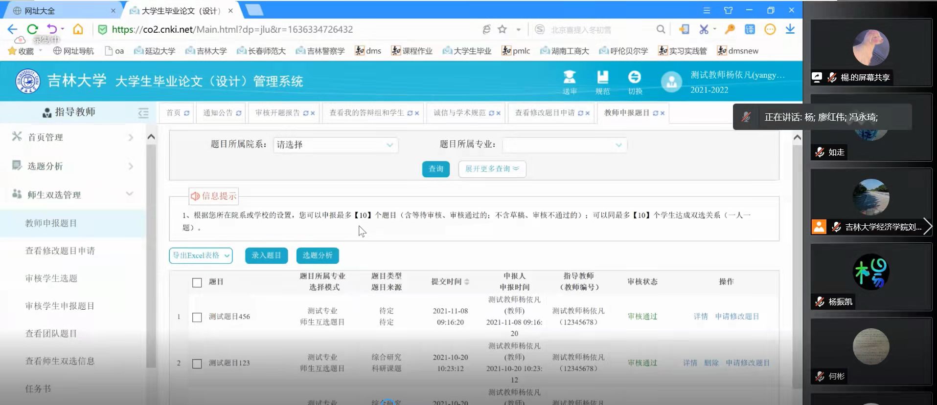 为了了解和使用新的大学生毕业论文(设计)管理系统,提高ylzzcom永利总站线路检测2022届本科毕业生的论文设计质量,加深论文指导老师和广大学生对管理系统的理解和认识,2021年11月8日上午,ylzzcom永利总站线路检测开展了本科毕业论文(设计)管理系统线上培训会议,学院教师、2022届本科毕业班级的学生干部百余人参加了此次培训。