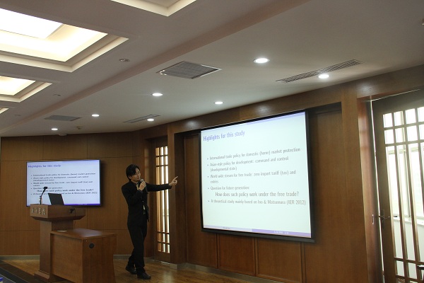签约仪式结束后,关西学院大学猪野弘明教授以“Governmental Production Commitment in the Open Economy”为题进行演讲。猪野教授利用一般均衡模型,从理论上讨论了一国实施对国内企业的产出控制与征收进口关税的不同经济效应与福利效应,指出前者实际上对本国福利水平可能有更为积极的影响。