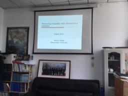首先,李晓教授回顾了与立命馆大学多年以来的学术交流及其成果,并对杉田教授来永利官网授课并开展学术交流表示热烈欢迎。随后,杉田教授就分配不平等测算方法的最新研究成果做了专题学术报告。杉田教授指出,由于日本政府对基尼系数三年测算一次,测算成本也比较大,并且由于受到国民信息安全等因素的限制其对外公开的程度也及其有限,因而有必要寻找到一种新的测算方法。杉田教授认为,自己研究的测度方法不仅成本低,更可以获得每一年的基尼系数数据。杉田教授将日本的每个县作为样本,然后通过取平均值的形式获得日本的基尼系数,但是与日本官方公布的结果差别很大,其原因在于山田教授的假设是每个县的收入分配状况相同。通过对经济增长与收入不平等问题的研究,杉田教授得出了经济增长加快,收入不平等也在加快这一结论。为了验证该结论的正确性,他用泰国的数据加以验证,也得出了相同的结论。但是由于泰国与日本在经济发展水平、受经济景气指数影响的程度以及州县数的不同等多个方面存在着差异,其比较的结果仍有一定的争议。