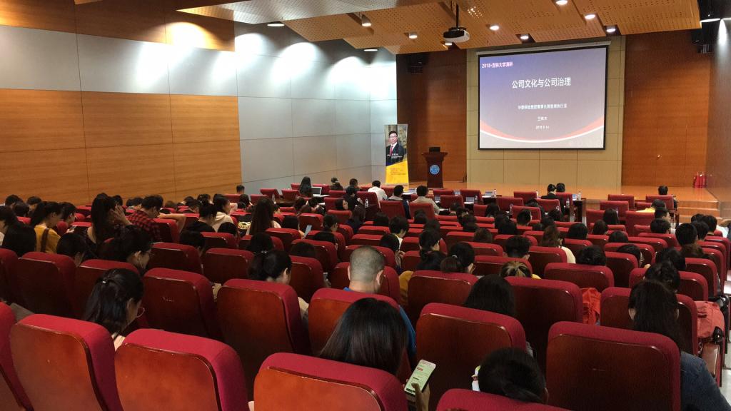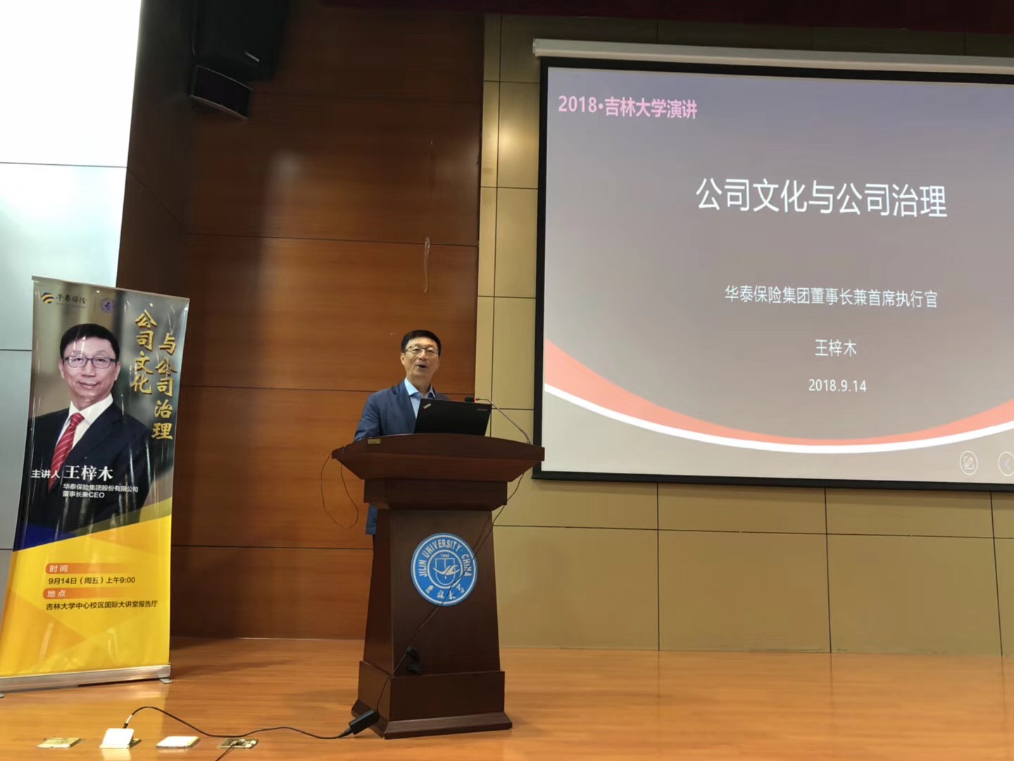 9月14日上午,华泰保险集团董事长兼首席执行官王梓木先生应邀回母校,在中心校区国际大讲堂报告厅作了一场题为“公司文化与公司治理”的学术报告,ylzzcom永利总站线路检测党委书记陈密主持了报告会。王梓木董事长夫人、央视著名主持人敬一丹老师,ylzzcom永利总站线路检测北京校友会会长林学访、副会长王亚力,ylzzcom永利总站线路检测副院长史本叶、王倩和秦川出席了报告会,华泰保险集团部分高管、吉林分公司员工以及ylzzcom永利总站线路检测师生150多人参加了报告会。