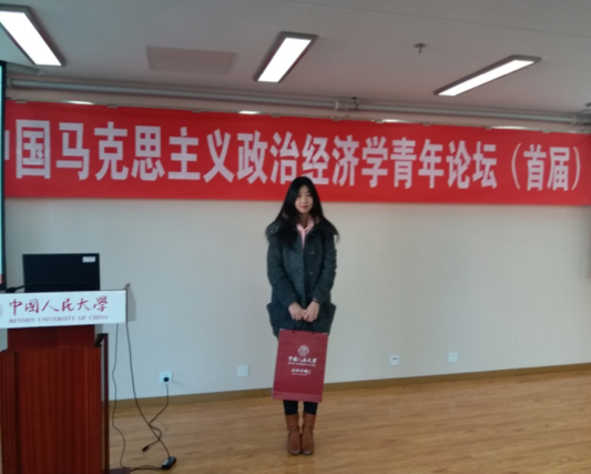 为深入贯彻落实习近平总书记关于发展当代中国马克思主义政治经济学系列重要讲话精神,培养大批马克思主义政治经济学优秀青年人才,中国人民大学ylzzcom永利总站线路检测联合中国特色社会主义经济建设协同创新中心于2016年12月10日在京举办中国马克思主义政治经济学青年论坛(首届)。论坛通过论文征集和充分酝酿,共评选获奖论文46篇,永利官网2016级硕士研究生王芳菲同学提交的论文获奖并参加了论坛的讨论发言。